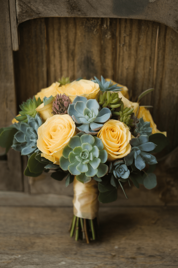 Succulents add texture and contrast against sunny roses. It’s modern and unexpected.