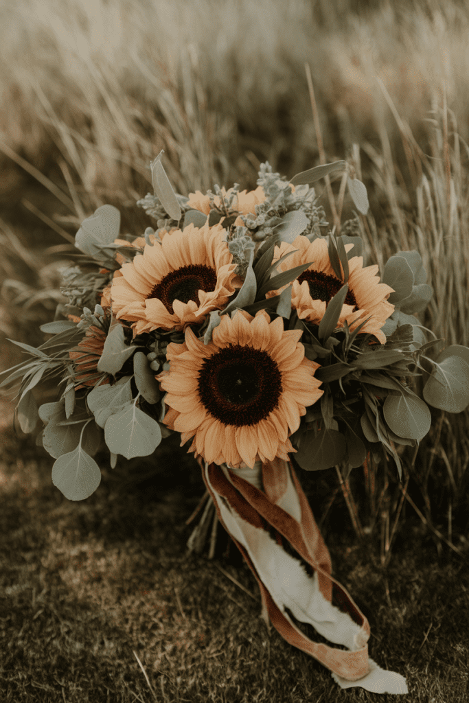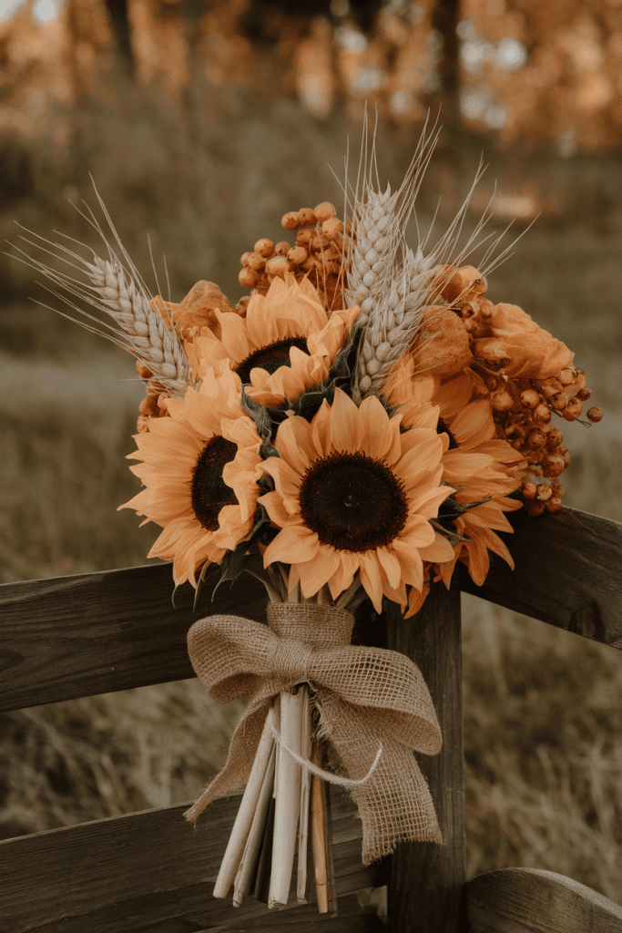 This one screams fall wedding perfection. Sunflowers plus dried wheat stalks feel earthy and warm.