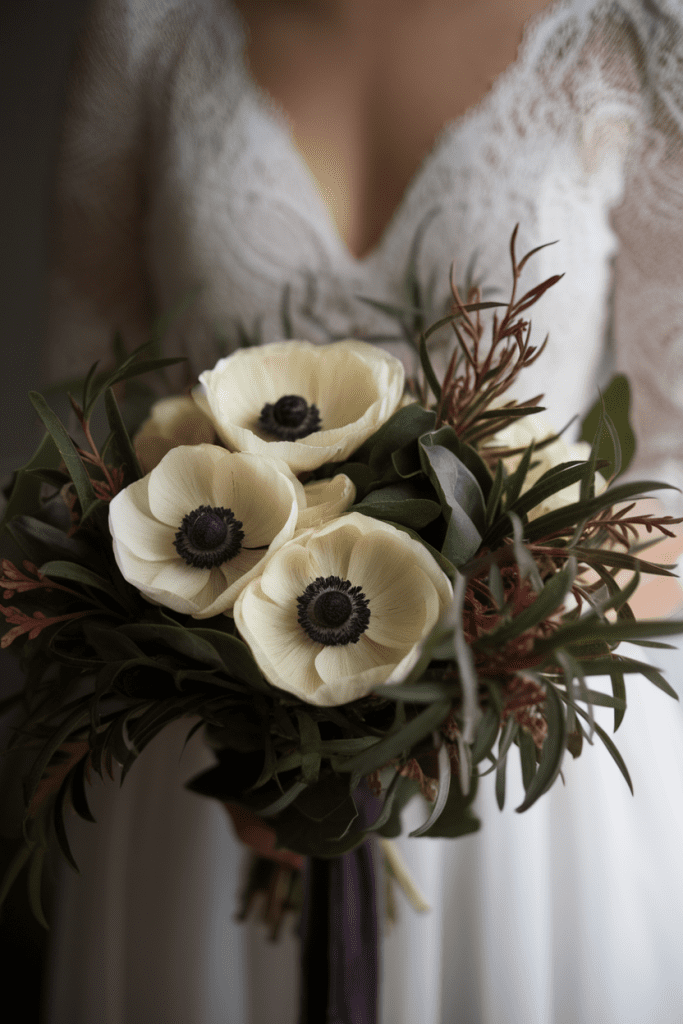 Yellow anemones with dark centers add instant edge. They’re bold yet bridal.