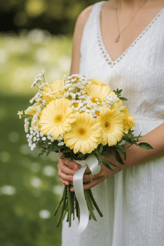 Add white daisies for contrast. Couples love it because it’s cheerful and photogenic.