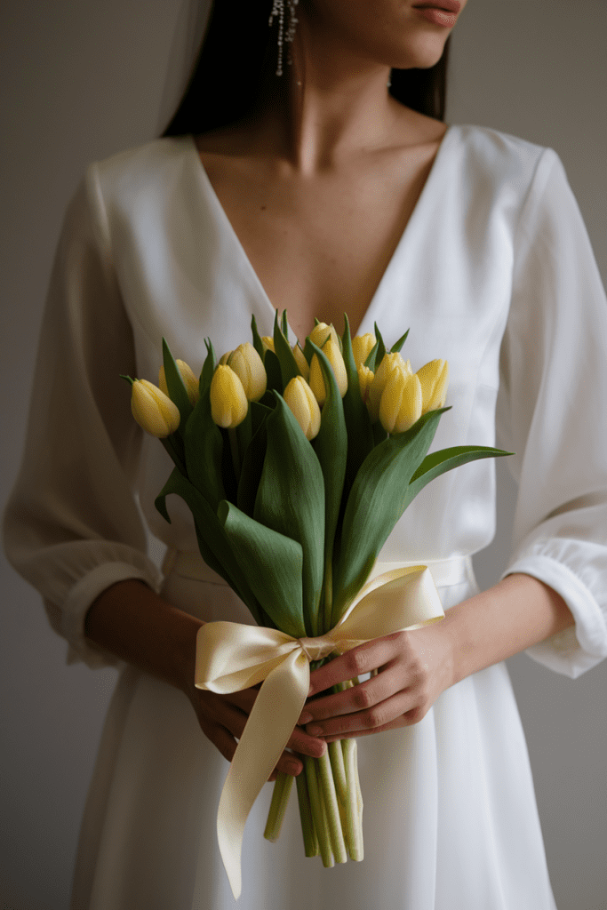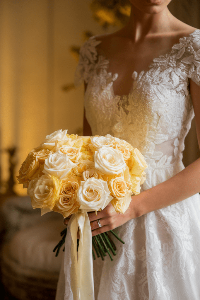 Yellow roses are elegant with a playful edge. They bring warmth without stealing attention from your gown.