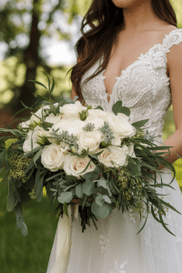 For winter weddings, white roses with pinecones and evergreen sprigs create cozy, seasonal magic. Add velvet ribbon and you’re golden.