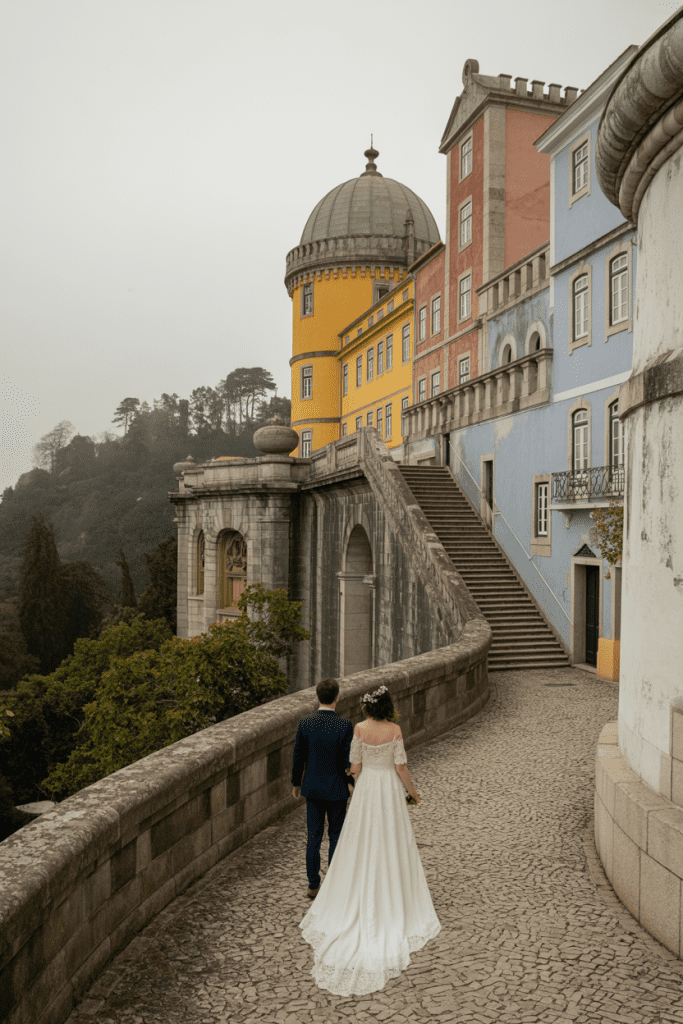 Sintra, a UNESCO World Heritage town, enchants with whimsical palaces, mossy forests, and misty hills. Elopements behind the Moorish Castle or at Pena Palace’s terraces offer fairy-tale settings combining history and romance.
