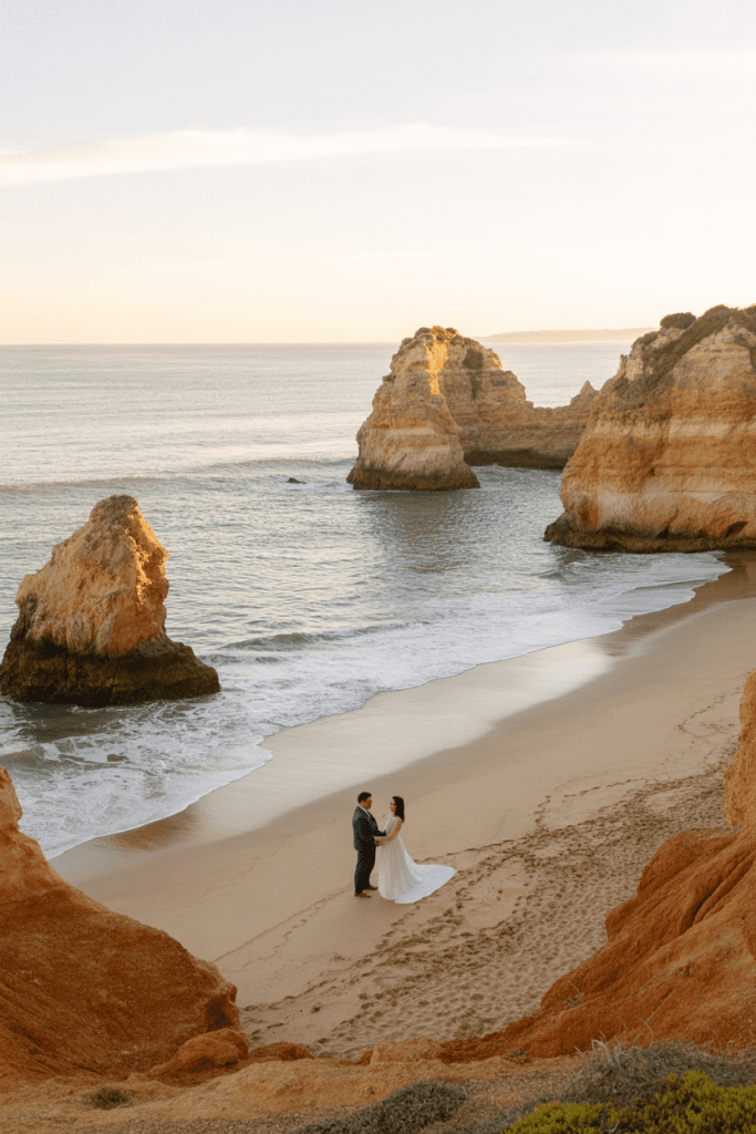 The Algarve’s rugged coastline boasts golden cliffs, hidden beaches, and turquoise waters ideal for romantic seaside elopements. Couples can exchange vows in secluded coves or cliff-top viewpoints like Ponta da Piedade, with the Atlantic Ocean as a dramatic backdrop.