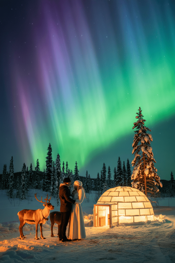 For winter wonderland romance, Lapland offers snow-draped forests, reindeer sleigh rides, and glowing Northern Lights. Couples can elope in glass igloos or charming snow chapels, surrounded by magical arctic stillness.
