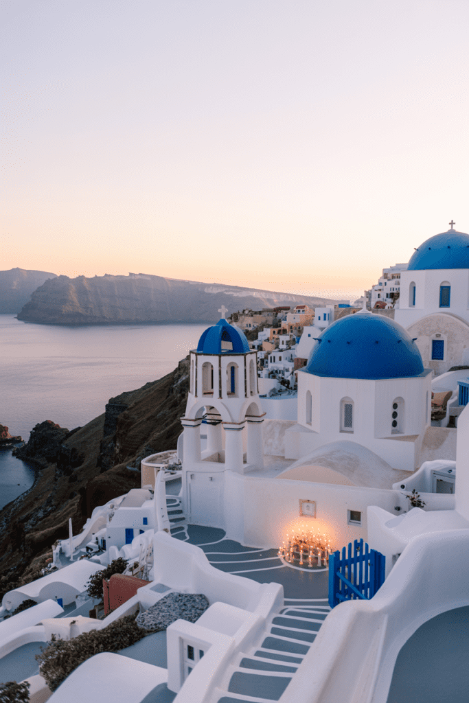 Perched above the Aegean Sea, Santorini’s Oia village is one of the world’s most iconic elopement spots. Its whitewashed architecture and sapphire-domed churches contrast spectacularly against deep blue waters, creating dreamlike sunsets celebrated in every elopement photo.