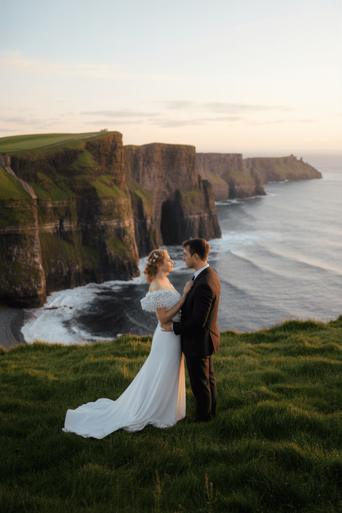 Few places rival Ireland’s Cliffs of Moher for sheer drama and emotional grandeur. Towering over 700 feet above the Atlantic Ocean, these cliffs provide breathtaking coastal vistas and cinematic wedding photographs. Imagine exchanging vows with waves crashing below, the wind weaving through your hair, and emerald landscapes unfolding endlessly behind you.