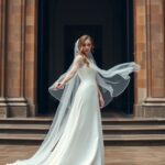Silk and satin wedding dresses shine with a luxurious feel that’s hard to ignore. Their smooth fabric drapes beautifully, creating a stunning silhouette that enhances the bride’s figure. When photographing these dresses, lighting is key. Natural light can showcase the fabric’s texture and sheen, highlighting the elegance of a minimalist bridal gown.