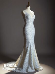 Silk and satin wedding dresses shine with a luxurious feel that’s hard to ignore. Their smooth fabric drapes beautifully, creating a stunning silhouette that enhances the bride’s figure. When photographing these dresses, lighting is key. Natural light can showcase the fabric’s texture and sheen, highlighting the elegance of a minimalist bridal gown.