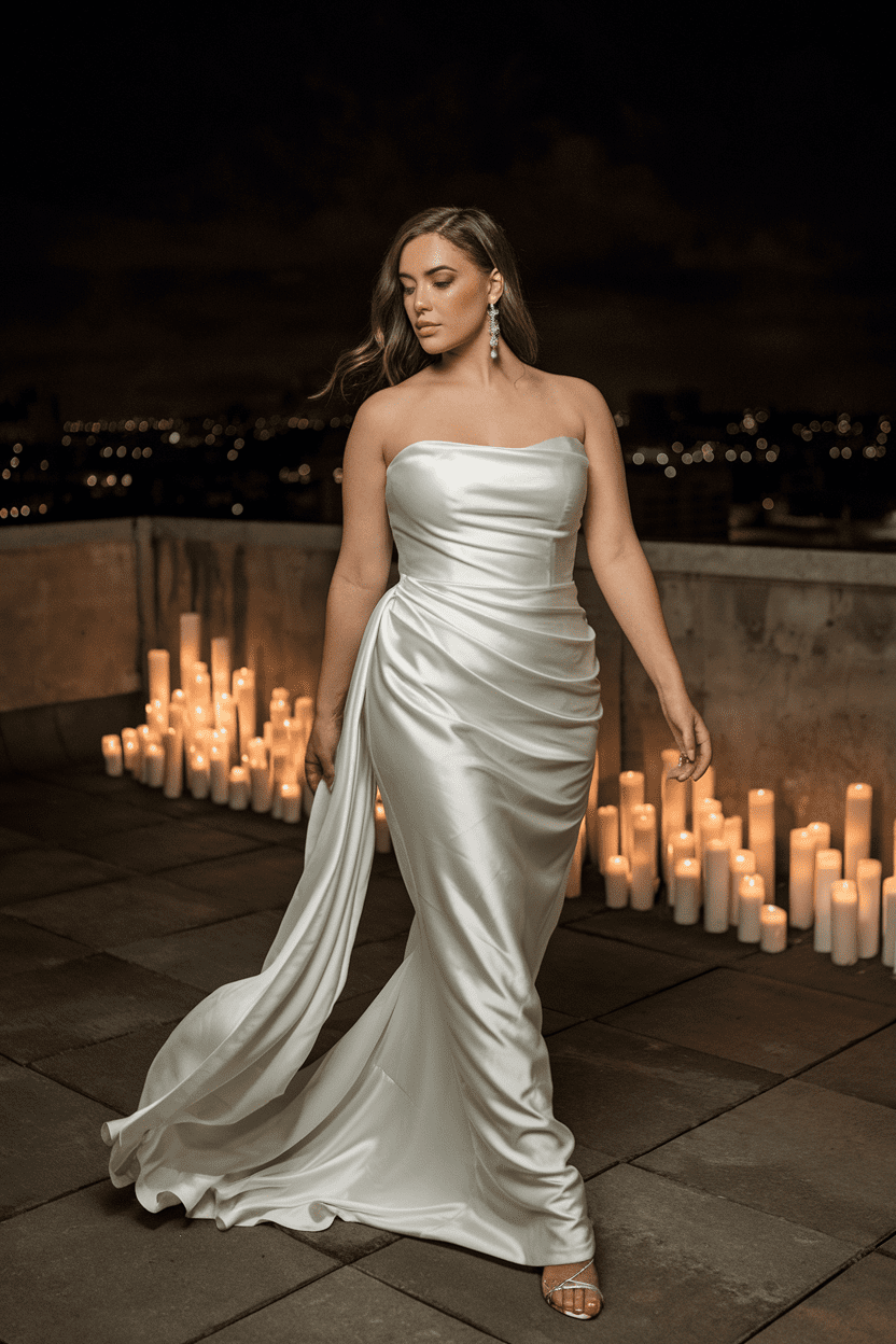 This one’s for the minimalist who still craves drama. A strapless, draped silk or crepe-back satin column smooths the silhouette and frames curves with liquid ease. It’s slinky without clinging and looks incredible in motion—think candlelit reception and soft jazz in the background.