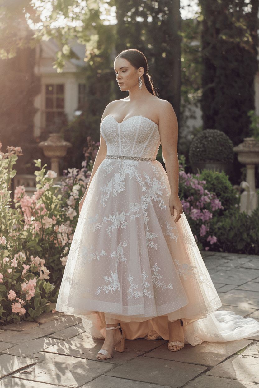 Lace can be tricky, but when it’s paired with a well-engineered bodice and an A-line skirt, it’s pure romance with practical support. You get definition at the waist, coverage where you want it, and that dreamy heirloom vibe that photographs like a fantasy.
