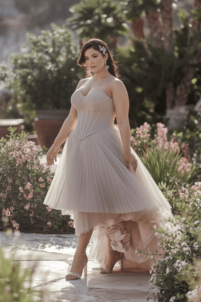Soft pleated tulle over a supportive strapless bodice gives ballerina energy with real-world stability. The pleats add dimension across the bust without adding bulk, and the light skirt floats beautifully in photos. It’s feminine, whimsical, and secretly practical.