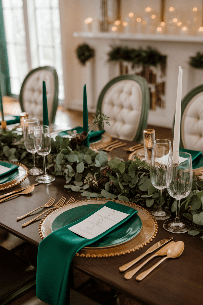 Emerald is having a major moment in 2025. Paired with champagne tones, it’s refined and chic. Bridesmaids in emerald gowns and tables dressed in champagne linens? Vogue-worthy.