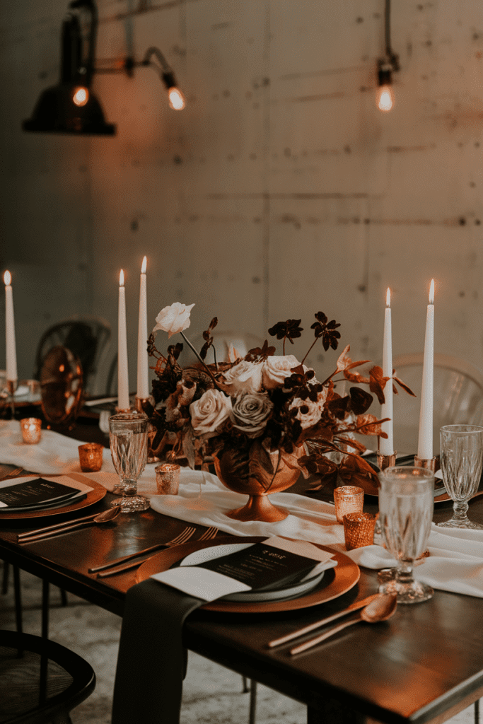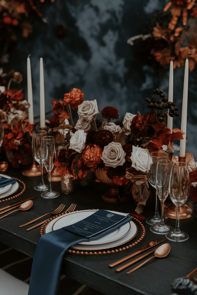 If you want a moody, luxe vibe, navy and copper are your power couple. Navy suits look killer in photos, while copper chargers or candleholders bring warmth. Together, it’s dramatic in the best way.