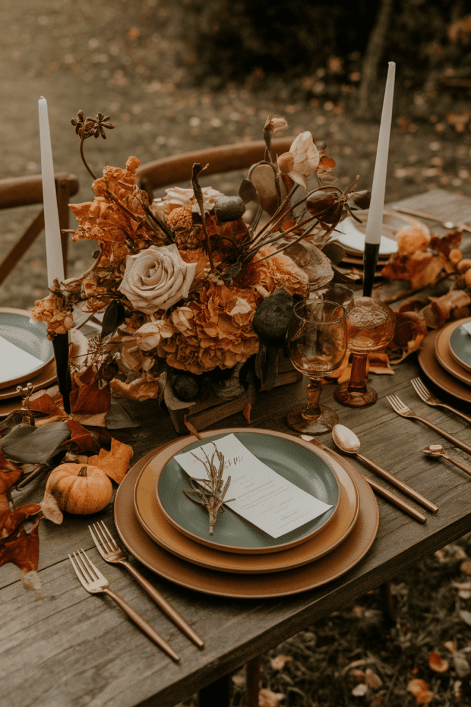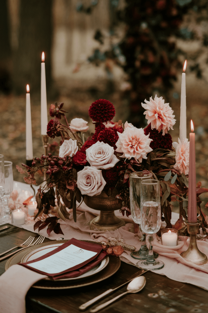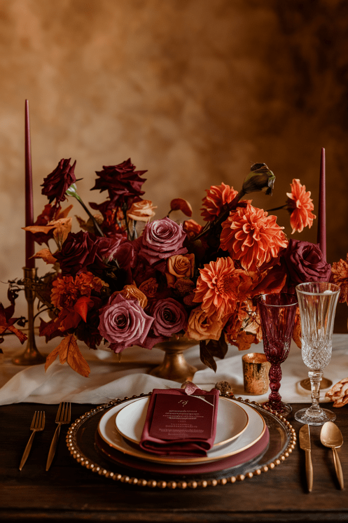 This combo screams fall, but in the most elegant way. Burgundy roses paired with burnt orange dahlias create warmth, while gold accents (flatware, candlesticks, ribbon) elevate the vibe from rustic to luxe.