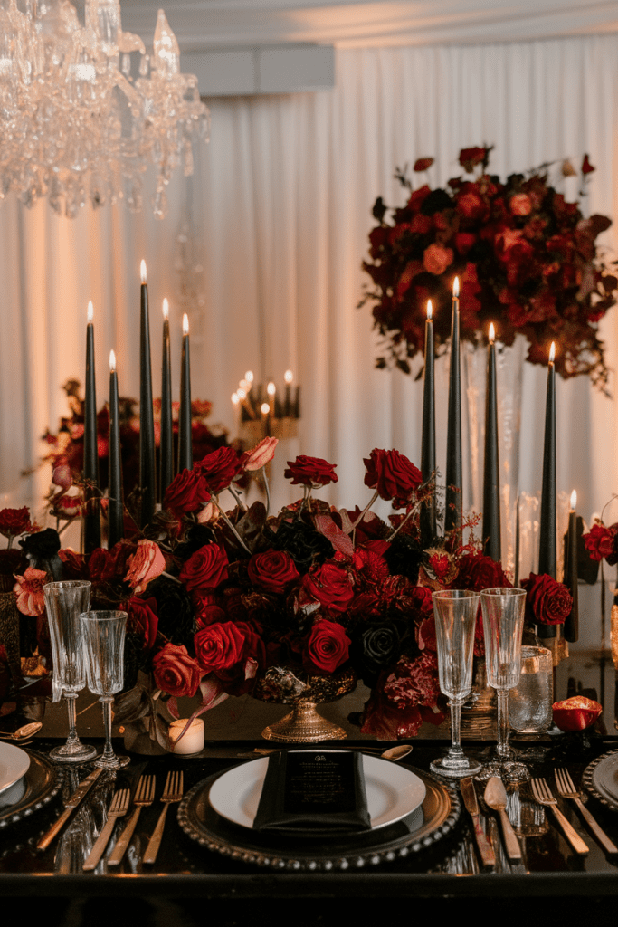Yes, black at weddings is chic now. Pair it with wine red, and you get a dramatic, moody vibe that’s peak sophistication. Imagine black taper candles, wine-red florals, and crisp white accents for balance.