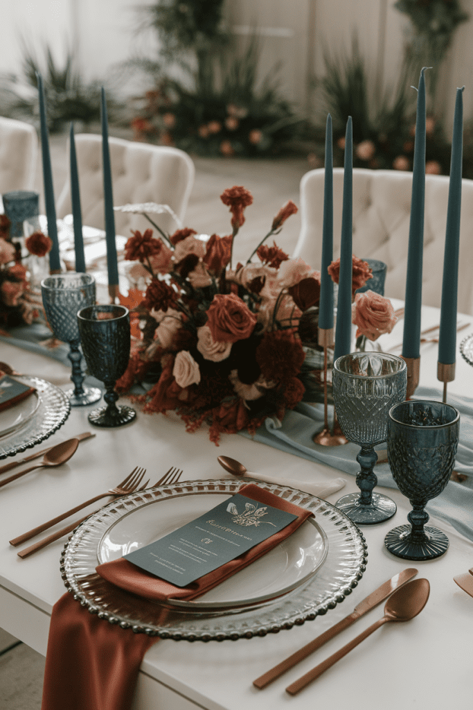 Styling tip: Use dusty blue in smaller details (like glassware or ribbons) so rust remains the anchor color.