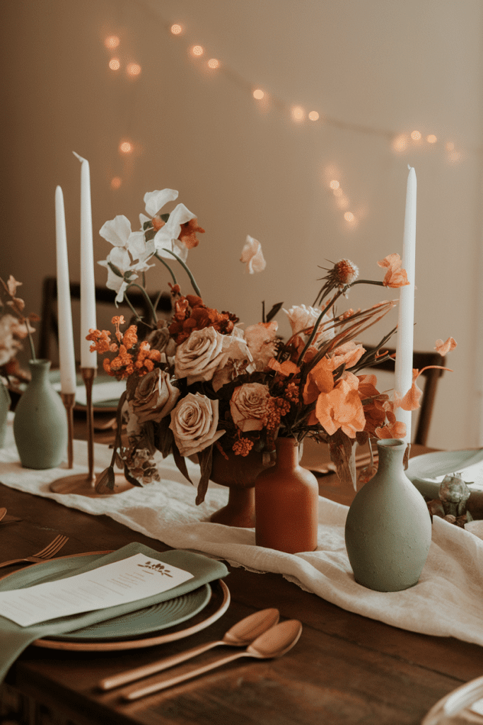 For couples who want a more playful fall palette, mustard and forest green feel earthy and cozy without going cliché. Add wood tones, and it looks like autumn in its best outfit.