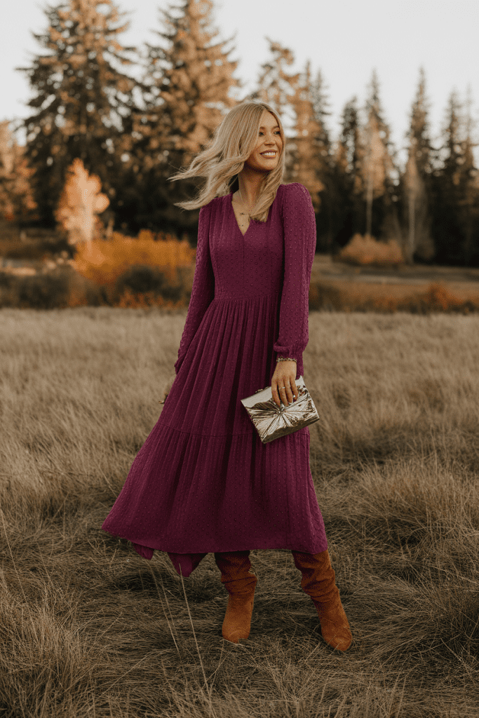 Plum is dramatic in the best way. A long-sleeve maxi keeps you warm without sacrificing elegance. Bonus: it looks stunning against fall foliage.