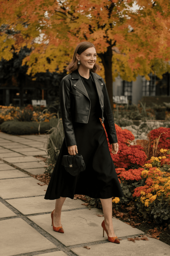 When in doubt, black works. For fall garden weddings, elevate it with a cropped jacket — leather for edge, tweed for polish.