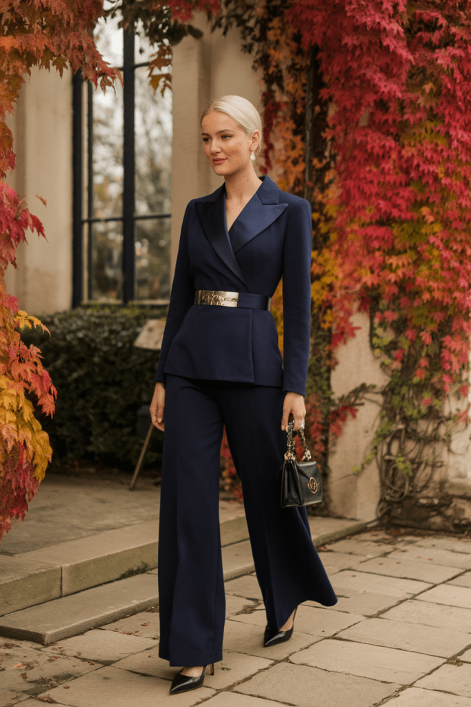 Not a dress person? A navy jumpsuit is sleek, versatile, and perfect for crisp garden evenings. The tailored vibe keeps it formal enough for weddings, while still comfy.