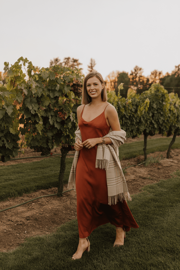 Rust is autumn’s unofficial color, and satin keeps it chic. A slip dress in this shade screams “fashion girl,” but you’ll want a layer when the sun dips.