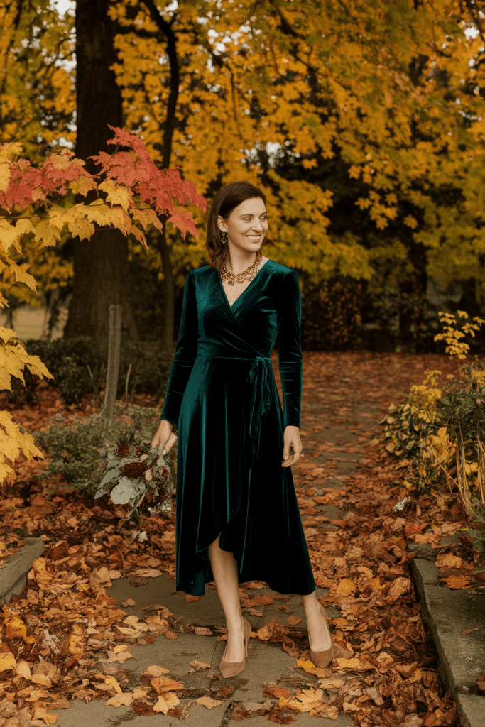 Velvet is fall’s cozy-luxe hero. In emerald, it looks lush, romantic, and wedding-ready. A wrap cut makes it universally flattering (and forgiving if you go hard on dessert).