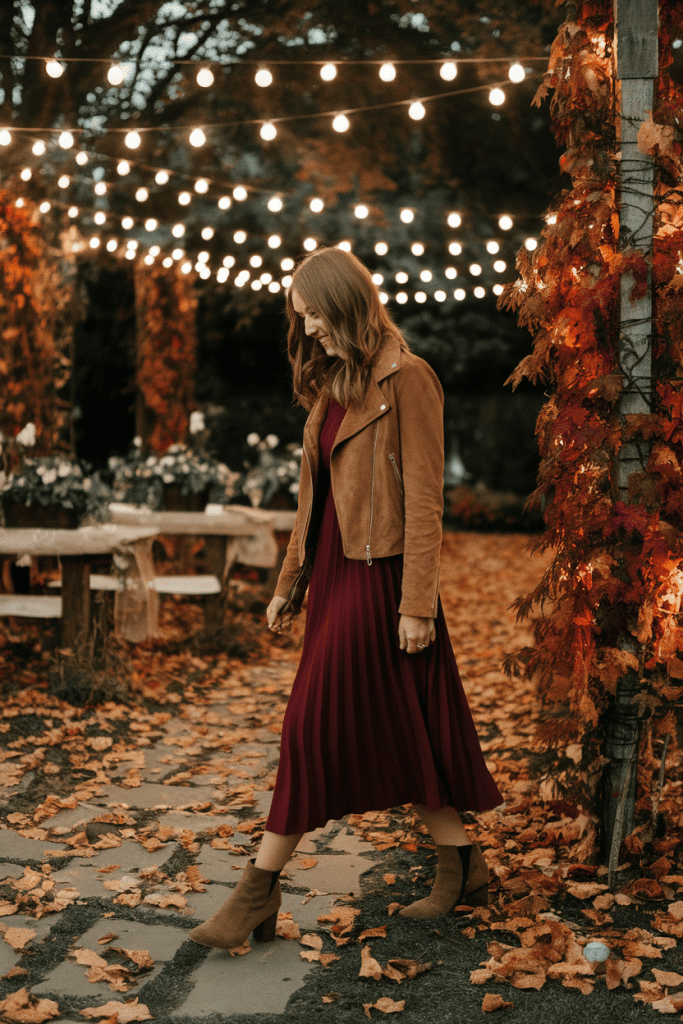 Burgundy is a no-brainer for fall weddings. It’s classic, rich, and looks amazing surrounded by golden foliage. A flowy midi in this shade feels romantic, while ankle boots make it garden-friendly.