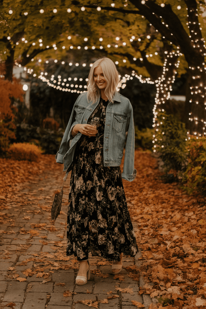 Yes, florals work in fall — you just need the right palette. Go for a dark floral maxi with earthy tones like plum, mustard, or navy. Add a denim jacket and suddenly the whole look feels perfectly rustic-chic.