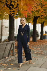 Not in the mood for a dress? A navy jumpsuit is modern, sleek, and comfortable. Add a statement belt to highlight your waist and give it a polished vibe.
