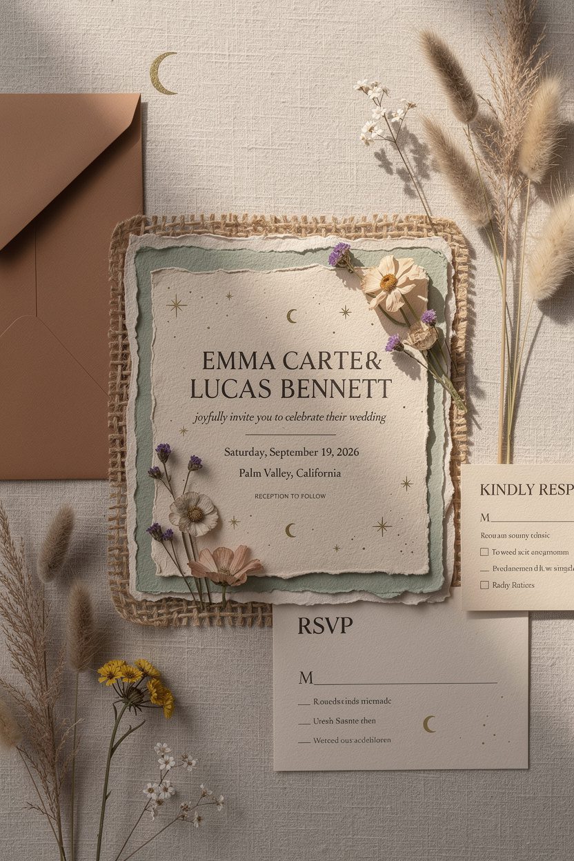 – Cotton or handmade papers add vibe and durability. – Vellum layers soften colors and add mystery. – Kraft or recycled papers lean rustic, earthy, and sustainable.