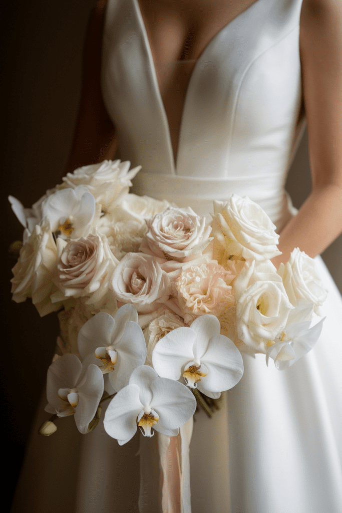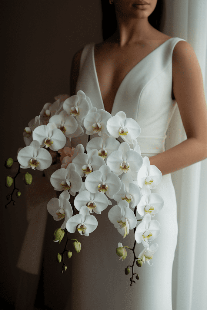 Orchids look like they belong in a five-star hotel lobby, which is exactly why they photograph so well. White or blush orchids in a cascading bouquet add drama without stealing the spotlight from your gown.