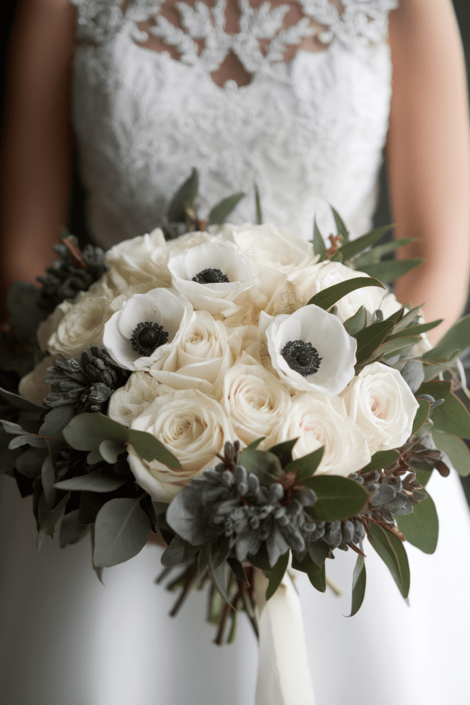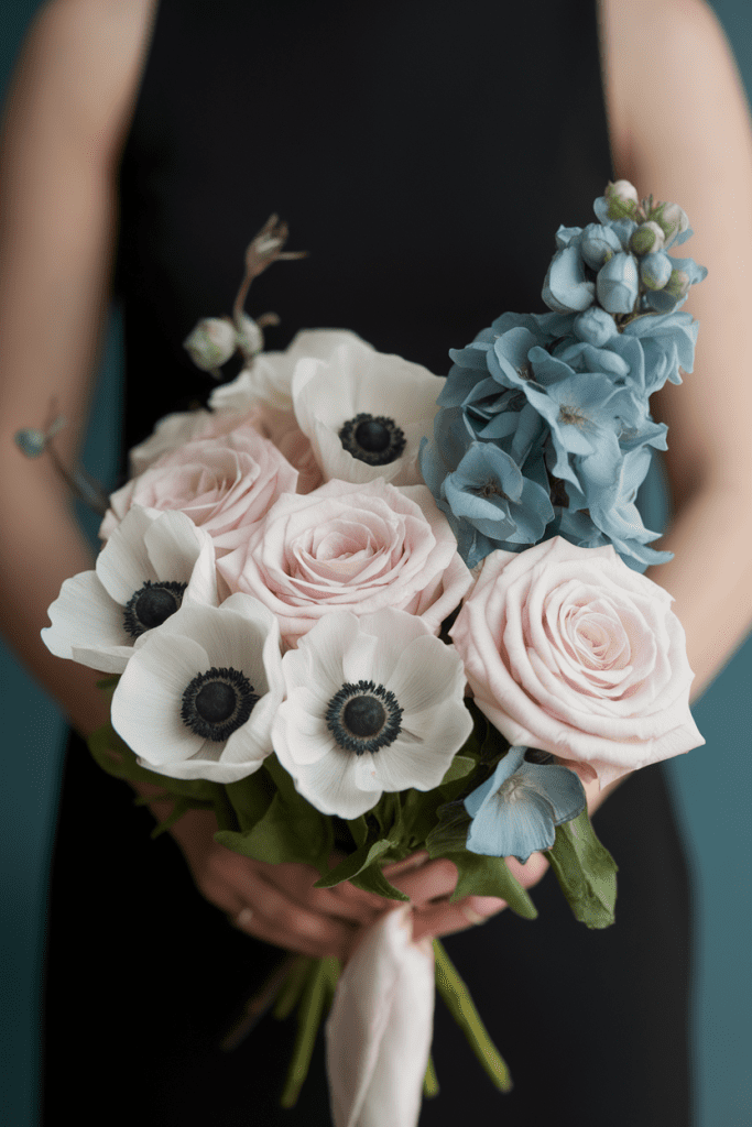 Anemones bring striking contrast with their white petals and bold black centers. They’re modern, graphic, and instantly add depth to any wedding photo.
