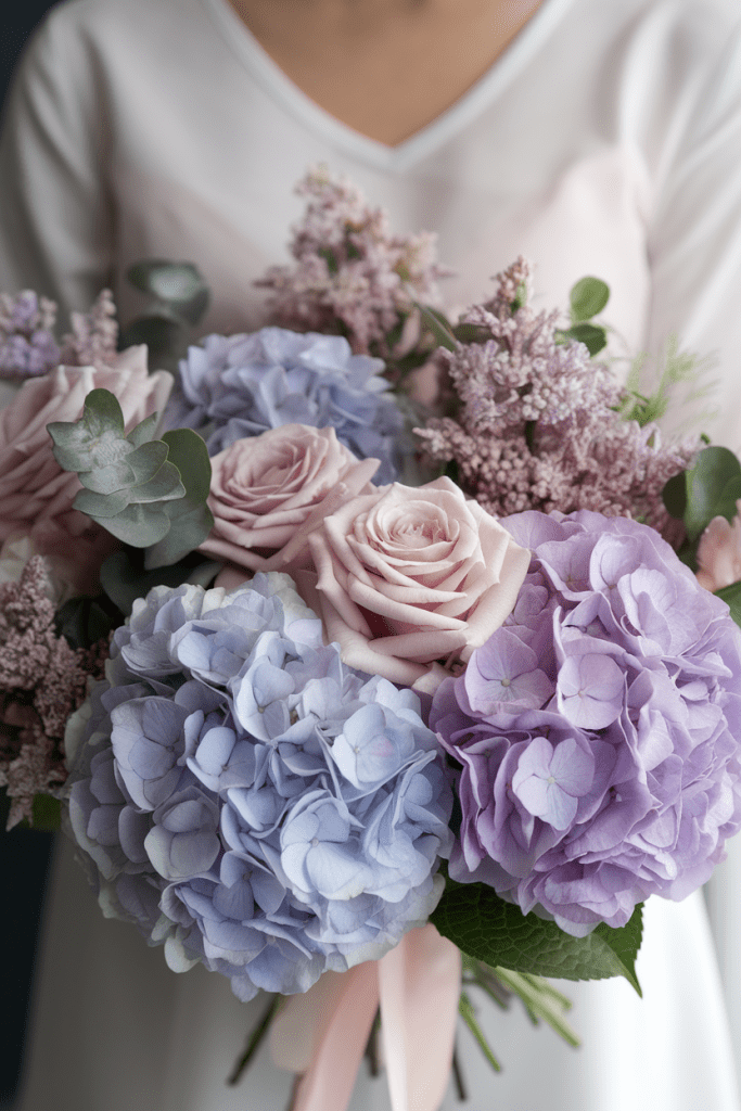 Hydrangeas bring volume without looking messy. A cluster of pale blue or soft lilac hydrangeas photographs dreamy, especially for garden or beach weddings.