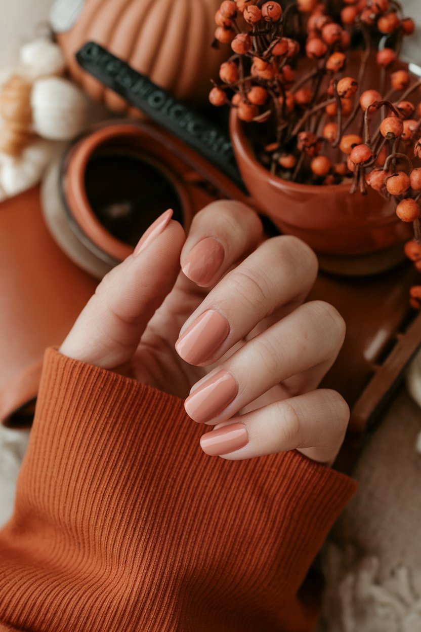 If warm tones are your go-to, a peachy pink with burnt undertones is the perfect fall pick. It brings a cozy, autumn-inspired vibe while still feeling fresh, soft, and beautifully feminine.