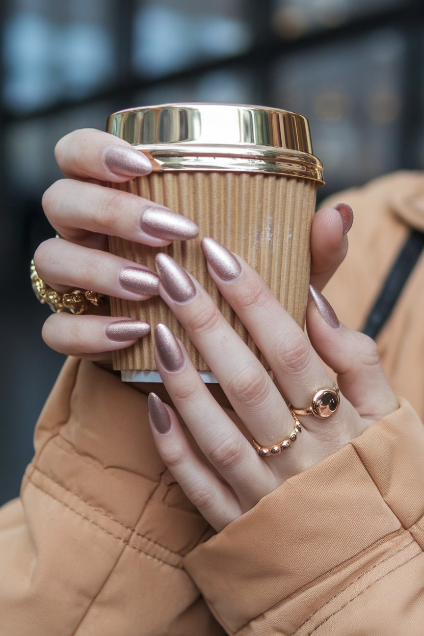 Torn between metallics and pink? Rose gold shimmer nails strike the perfect balance. They bring a hint of glam with their radiant glow, yet remain soft enough for everyday elegance. It’s a luxe look that never tries too hard.