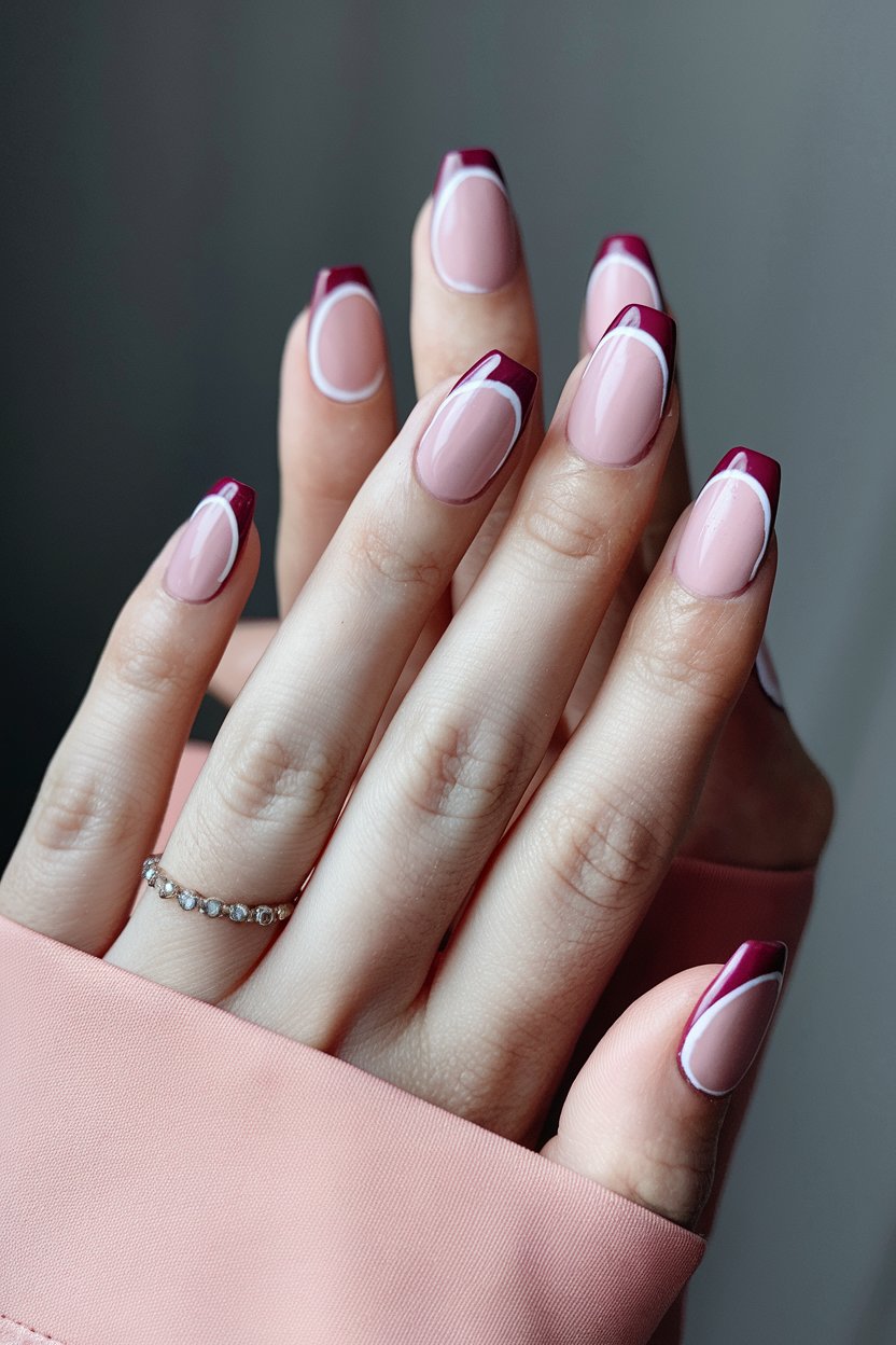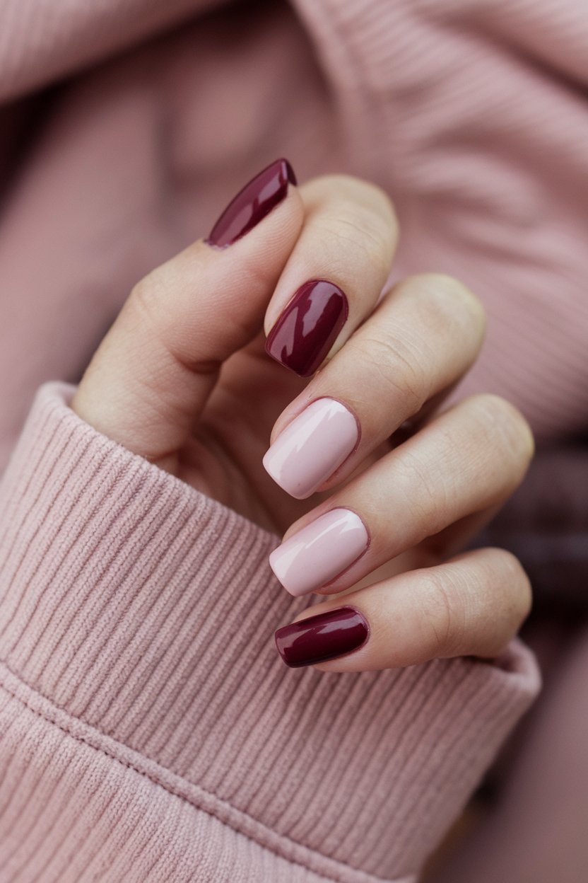 Torn between soft pink and a bold fall shade? Combine the two for a look that’s effortlessly chic. Pairing burgundy with blush pink in a two-tone or accent design creates a striking contrast that’s perfect for the season. It’s the ultimate fall nail combo.