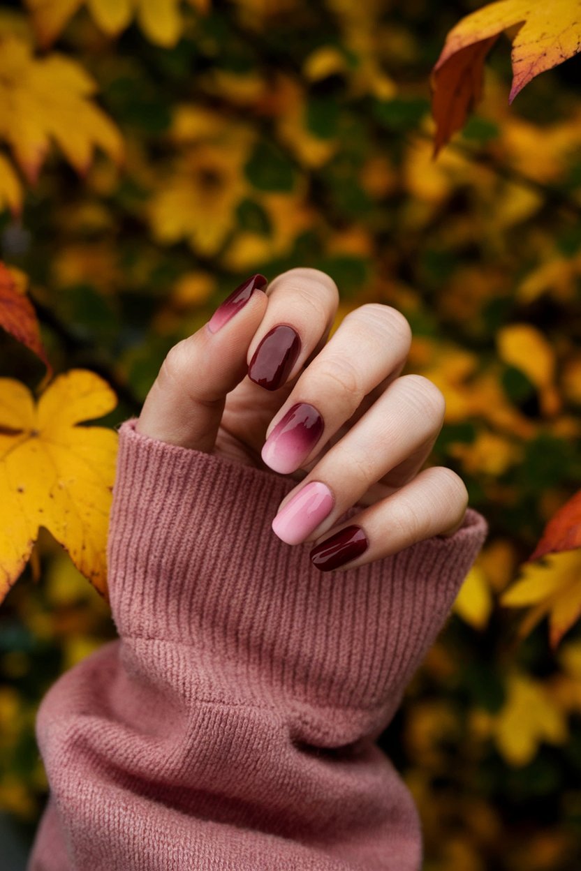 Ombre nails aren’t going anywhere, and a burgundy-to-pink gradient is the ultimate fall statement. The blend of deep, warm tones feels rich, refined, and completely on point for cozy latte days and crisp autumn air.