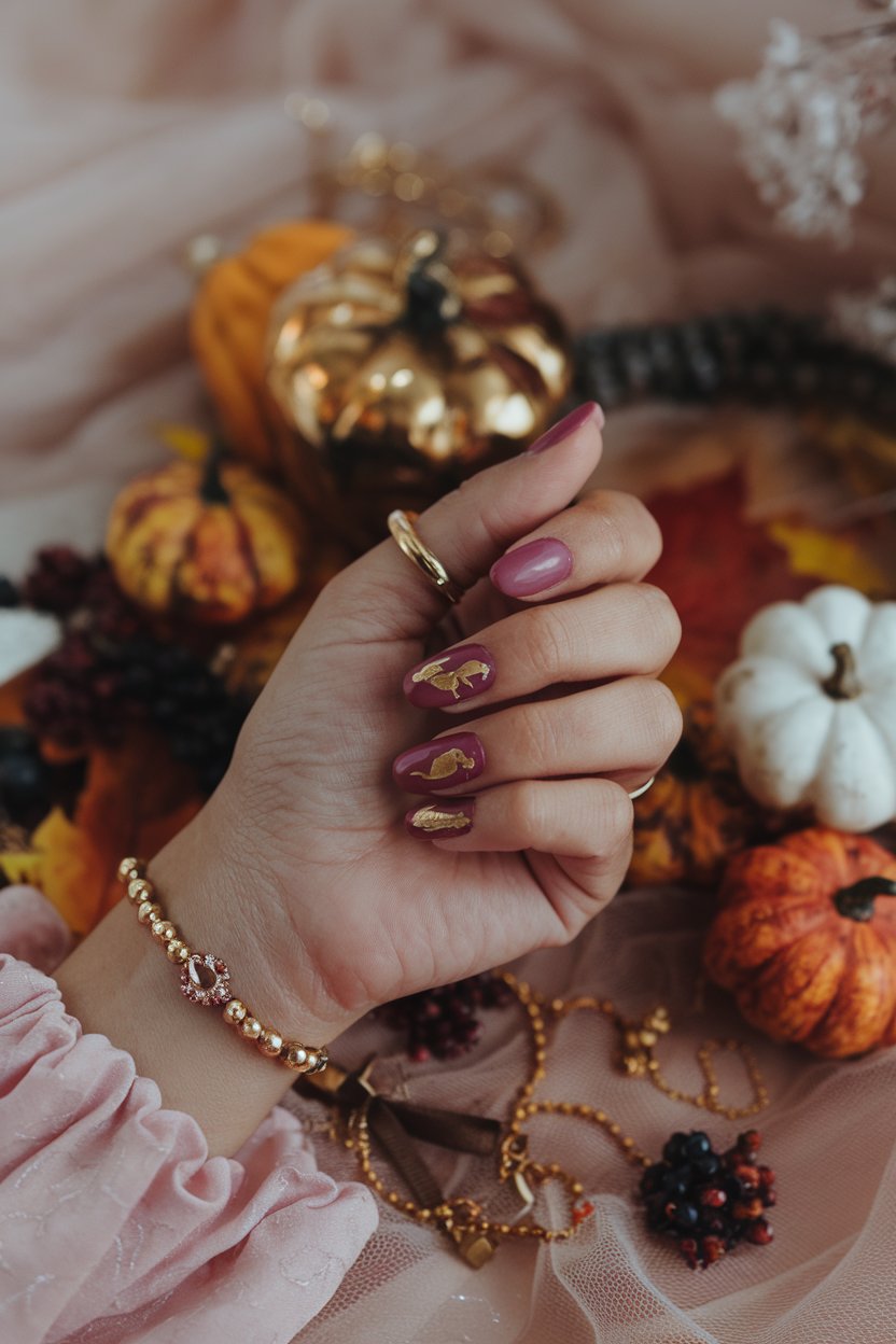 Deep plum pink shades are a fall favorite on their own, but add a touch of gold foil and the look instantly turns luxe. This rich, elegant combo is perfect for autumn weddings, special occasions, or anytime you want your nails to make a statement.