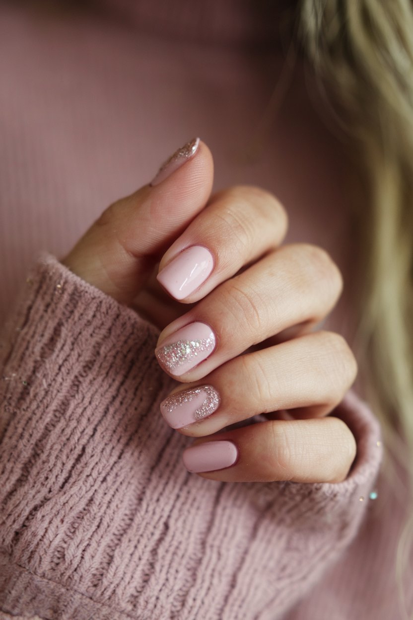 If you’re all about a touch of sparkle (and let’s be honest, who isn’t?), start with a soft blush pink base and add glitter accents to just a few nails. It’s the perfect blend of sweet and festive, giving you a glam look that still feels effortlessly chic.