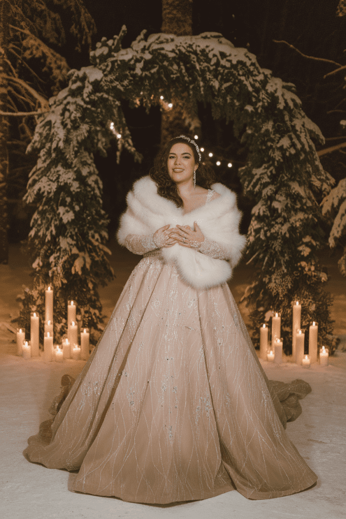 Winter weddings exude a sense of magic, from sparkling snow to candlelit ceremonies. For plus size brides, winter gowns often incorporate heavier fabrics like brocade, velvet, or layered satin to provide warmth while maintaining elegance. Long sleeves are a common choice, offering coverage and sophistication. Brides may also lean toward higher necklines, which not only feel seasonally appropriate but also create a refined and regal appearance. Embellishments take center stage in winter, with crystal beading, sequins, or metallic embroidery reflecting the festive spirit of the season. Dramatic ball gowns or full skirts look especially striking in indoor venues, while capes or faux fur wraps offer both style and practicality for outdoor photos. Many brides love how winter weddings allow for bolder choices, from glittering details to grand silhouettes. The result is a bridal look that feels glamorous, warm, and unforgettable.