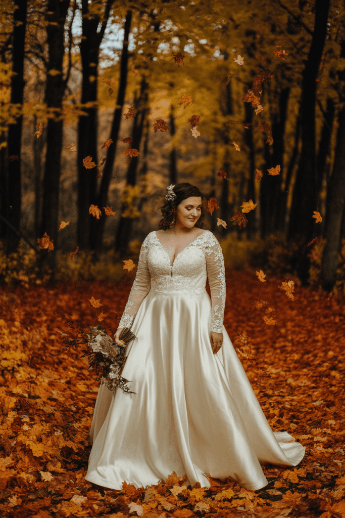 Fall weddings are known for their warmth, rich color palettes, and dramatic natural backdrops. For plus size brides, this season is perfect for exploring heavier fabrics like satin, mikado, or velvet, which drape beautifully and enhance curves. Long-sleeved gowns often come into play during autumn, providing both comfort and elegance as the air grows cooler. Many brides embrace deeper tones in their accessories or embellishments, such as gold embroidery or jewel-toned sashes, to echo the season’s palette. Layered skirts and dramatic trains feel particularly fitting, adding to the sense of romance that autumn inspires. Illusion sleeves or lace overlays work beautifully, offering coverage while still maintaining lightness. Brides can also experiment with accessories like capes or shawls for outdoor ceremonies. Fall gowns often strike a balance between regal drama and cozy sophistication, ensuring the bride feels both confident and seasonally attuned.