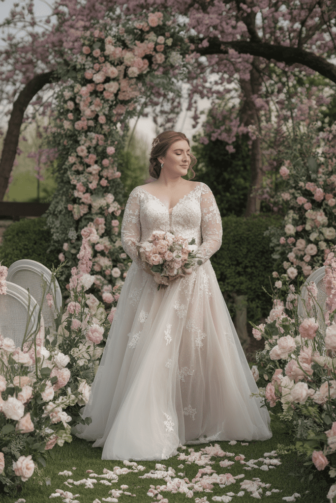 Spring weddings are often associated with renewal, romance, and soft details. For plus size brides, spring offers the chance to wear lighter fabrics without sacrificing structure. Chiffon and tulle are particularly popular choices, as they create an airy feeling while still flowing beautifully over curves. Lace accents also feel at home in spring, adding delicate charm without overwhelming the dress. Since spring weather can be unpredictable, brides often choose gowns with removable sleeves or matching jackets that can be added if the temperature drops. Floral appliqués or embroidered details look especially fitting, mirroring the natural surroundings. Many brides lean toward A-line or ball gown silhouettes, as these provide comfort and movement while complementing a garden or outdoor venue. Spring weddings call for dresses that balance softness with flexibility, ensuring the bride looks radiant even if the day brings both sunshine and showers.