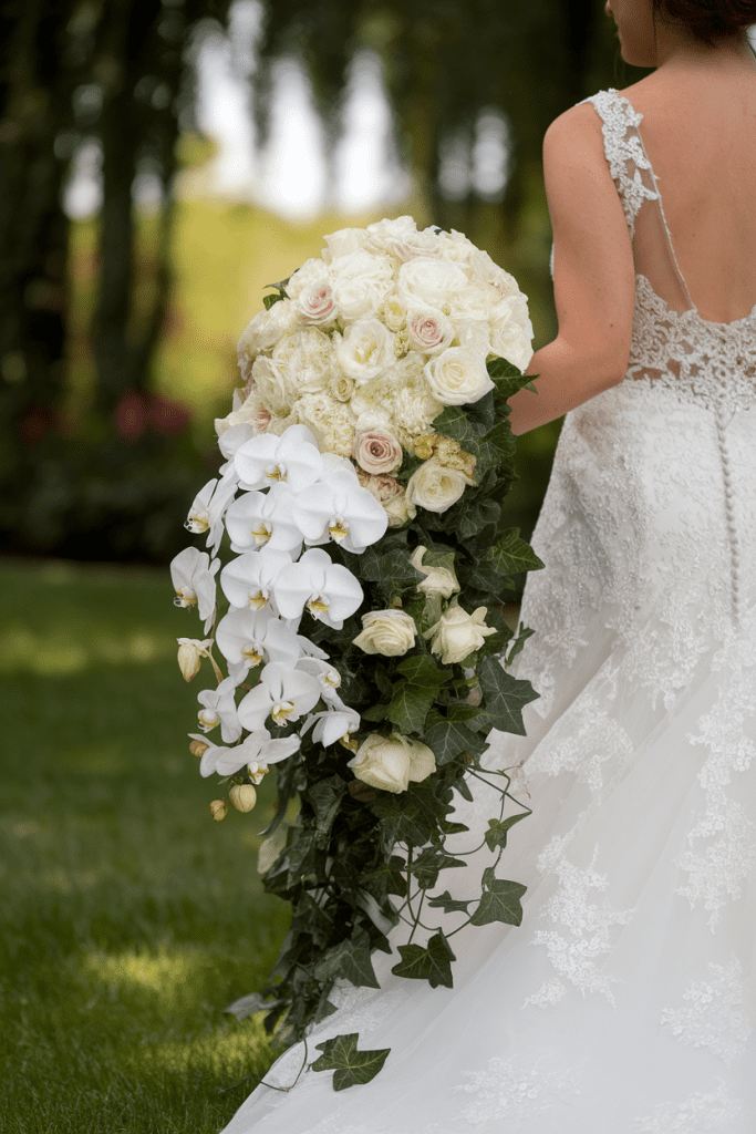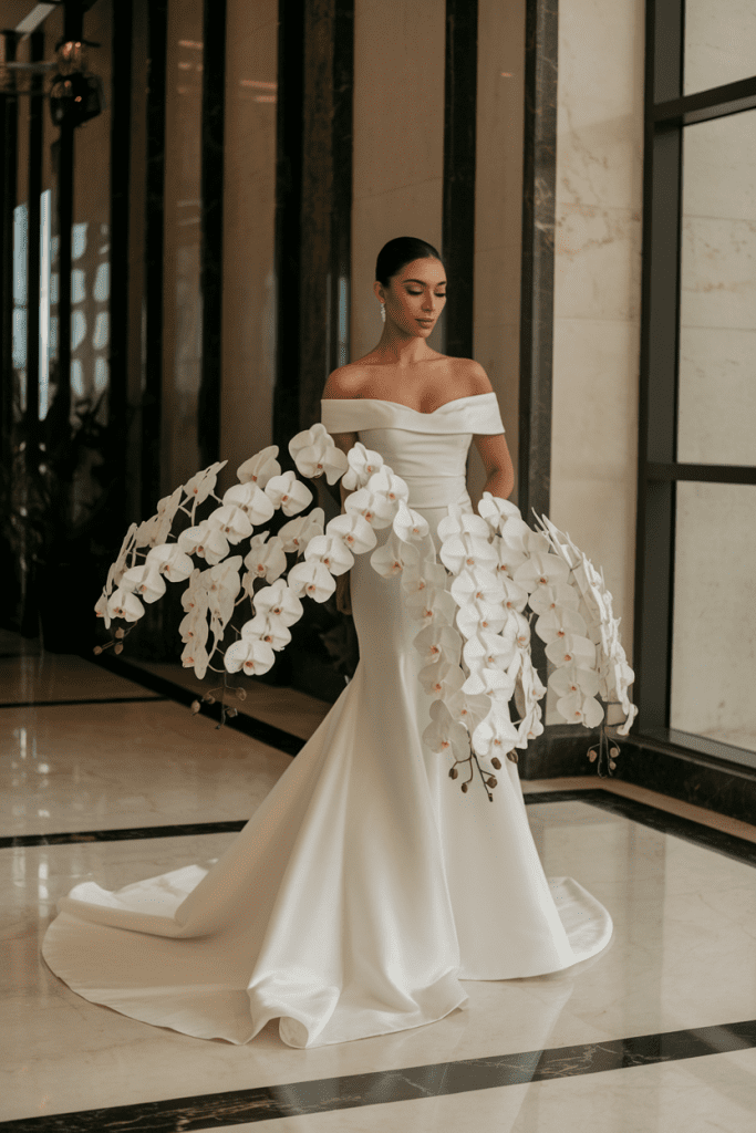 Want drama? Orchids. A cascading white orchid bouquet feels luxe, sleek, and straight off a couture runway. It’s perfect if you’re going for a modern, glam vibe.