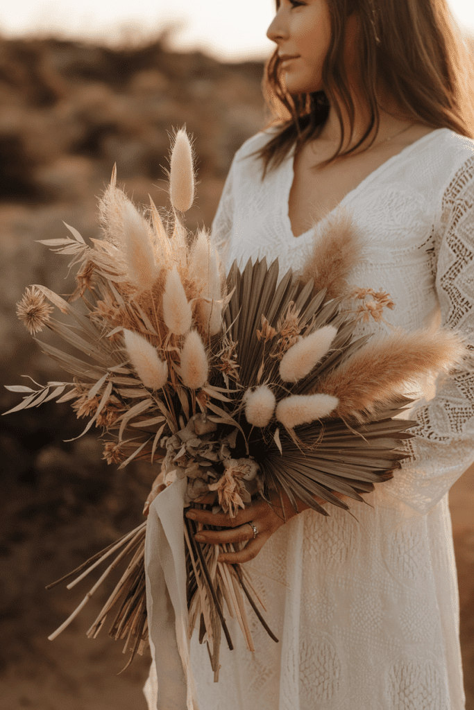Dried flowers like pampas grass, bunny tails, and bleached ruscus are perfect for boho brides. They’re long-lasting and totally unique.