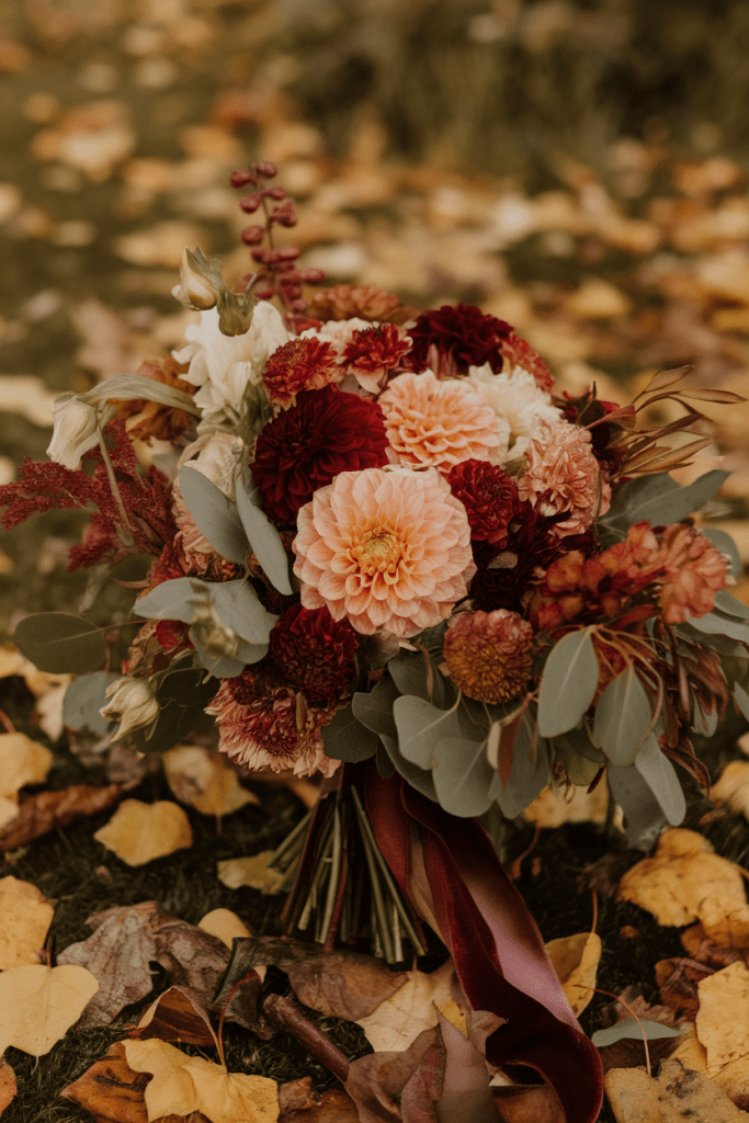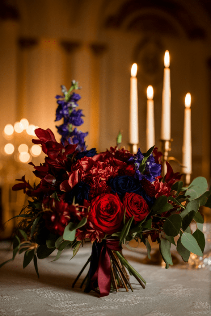 Deep burgundy dahlias, navy delphiniums, and dark roses are made for moody fall weddings. They pop beautifully against white gowns and candlelit venues.
