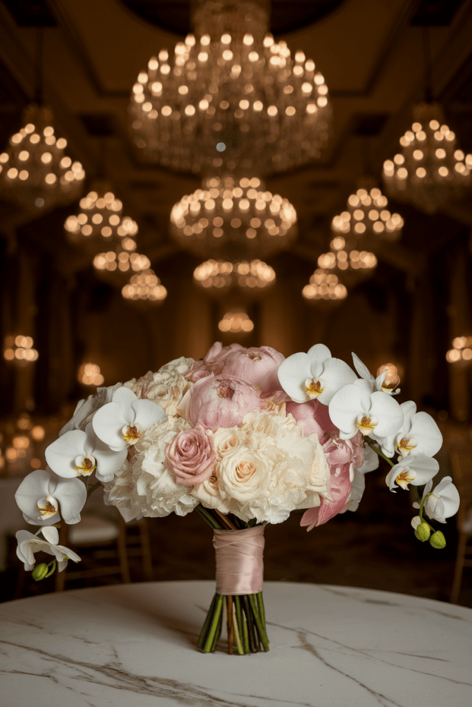 Mix big-name blooms like orchids, peonies, and roses into one over-the-top bouquet. Add silk ribbon or embellishments for extra drama.