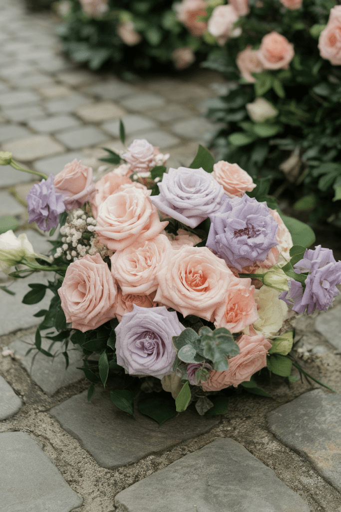 Soft pastel roses (peach, lavender, blush) bring a dreamy vibe. Layer them with greenery and you’ve basically got “romantic garden chic” nailed.