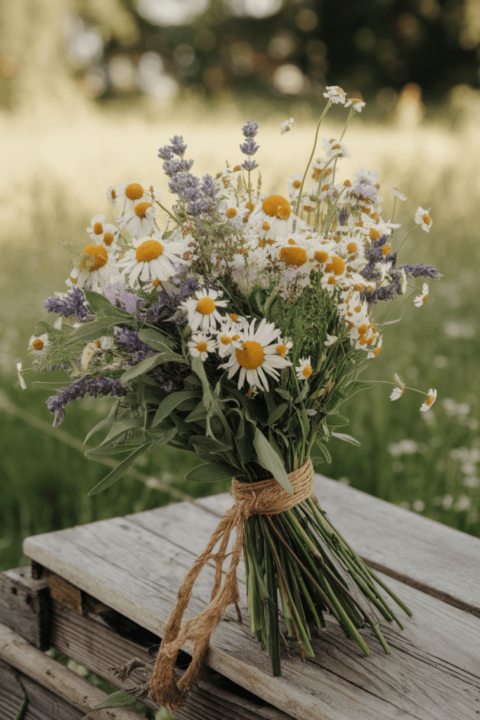 If your wedding is rustic or outdoorsy, a wildflower bouquet feels effortless and personal. Think daisies, lavender, chamomile, and colorful filler blooms tied loosely with twine.