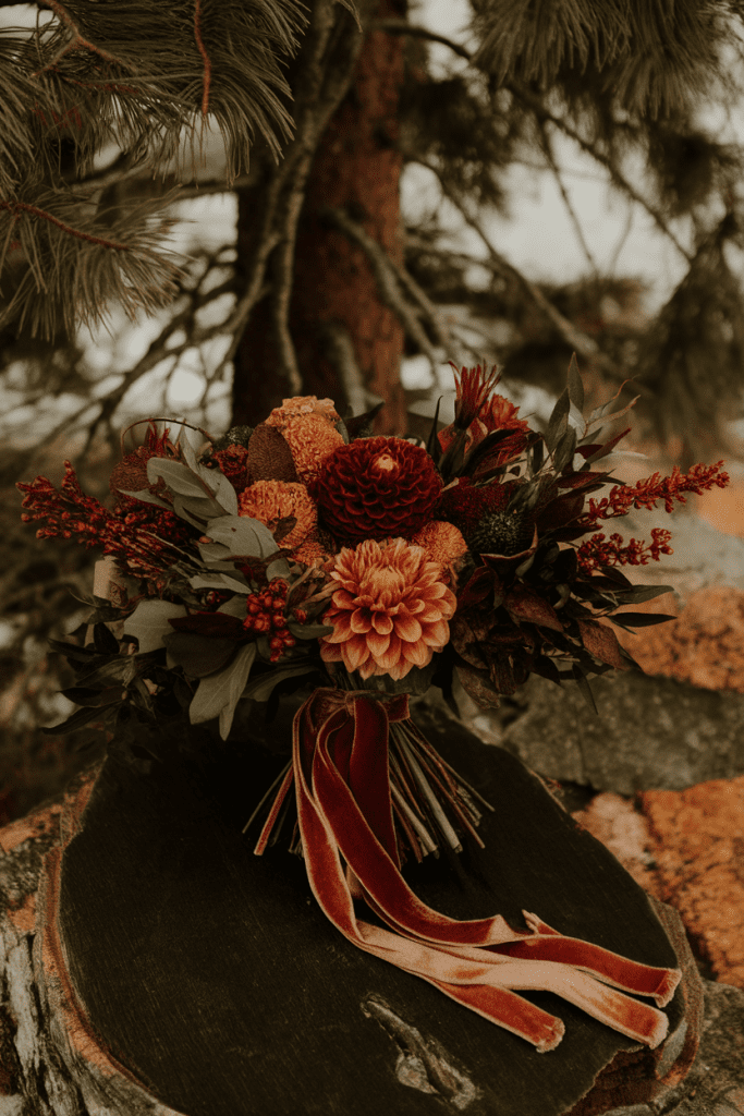 For a lodge or mountain backdrop, rich autumnal tones work beautifully. Think rust dahlias, golden marigolds, and dark greenery.